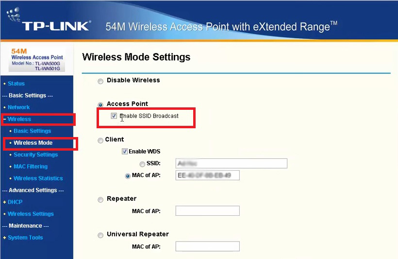 نفس الطريقة نقوم بتعطيل خاصية SSID Broadcast كما في الصورة اسفله.